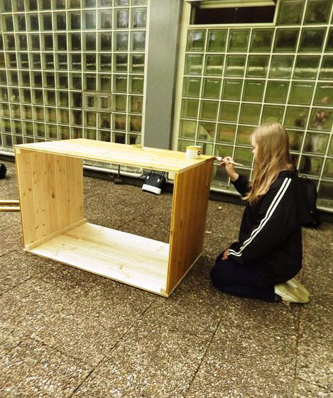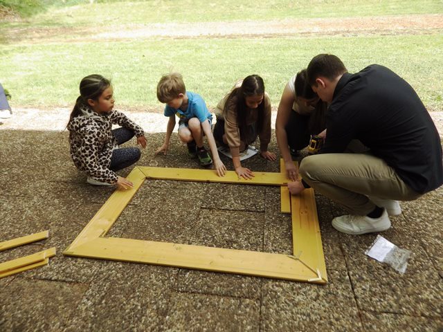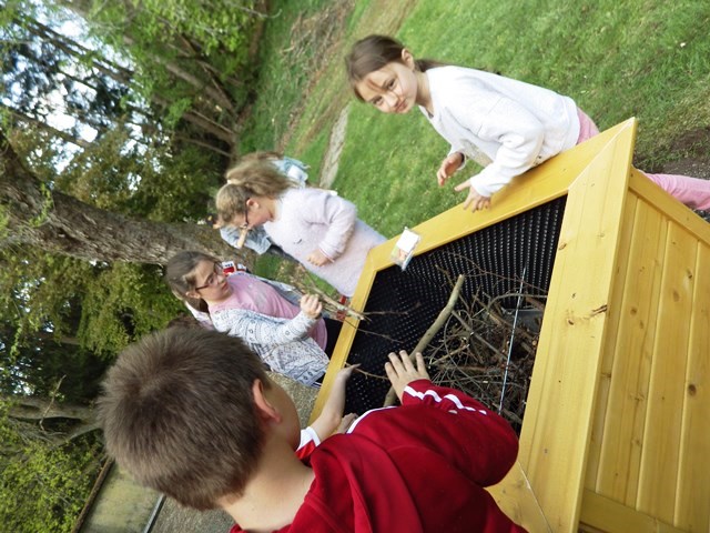 Endlich war es soweit. Einige Mitarbeiter der VR-Bank bauten unser Hochbeet auf und wir durften dabei helfen. Wir strichen das Holz an einigen schwer zugänglichen Stellen nach und sammelten fleißig Ästchen und Stöcke. Damit sollte das Hochbeet zuerst befüllt werden.