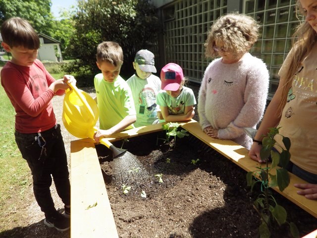 Anschließend füllten wir noch Grasschnitt und Komposterde ein. Dann konnte das Pflanzen beginnen. Die Kinder hatten eine Paprikapflanze, Gurkenpflanzen und eine Kürbispflanze mitgebracht, außerdem säten wir Radieschen an. Eine Tomatenpflanze bekam einen geeigneten Unterstellplatz in einem Topf.