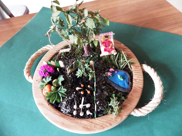 Naturmaterialien und Knete einen Garten mit vielen Gemüsebeeten, mit