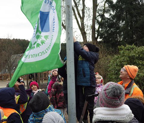 Am Vorlesetag Mitte Dezember wurde die neue Umweltfahne in Anwesenheit von Bürgermeister Peter Ebertsch und allen weiteren Gästen, Kindern und Lehrkräften gehisst. Gemeinsam mit Hausmeister Rudi Petersam zogen einige Schüler stolz die Fahne in die Höhe. Sie wird nun für ein weiteres Jahr auf unserem Schulhof wehen.