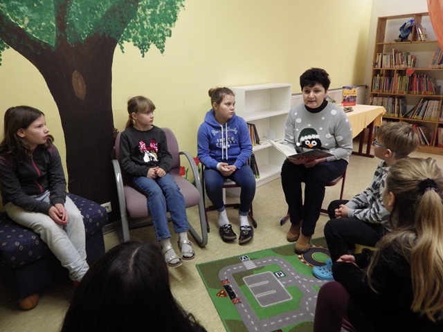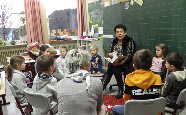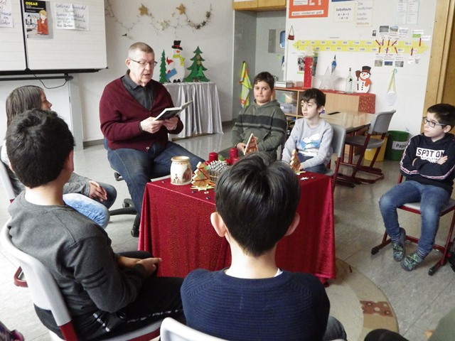 Unsere Lesepatin Marietta Rösler trug den Schulanfängern mehrere weihnachtliche Kurzgeschichten vor und der ehemalige Rektor Dietmar Schmidt hatte sich für die Größeren das Buch „Oskar und die falschen Weihnachtsengel“ ausgesucht.
