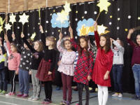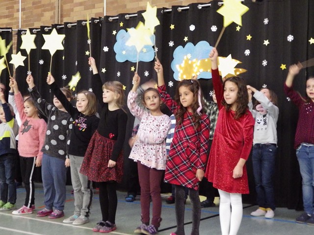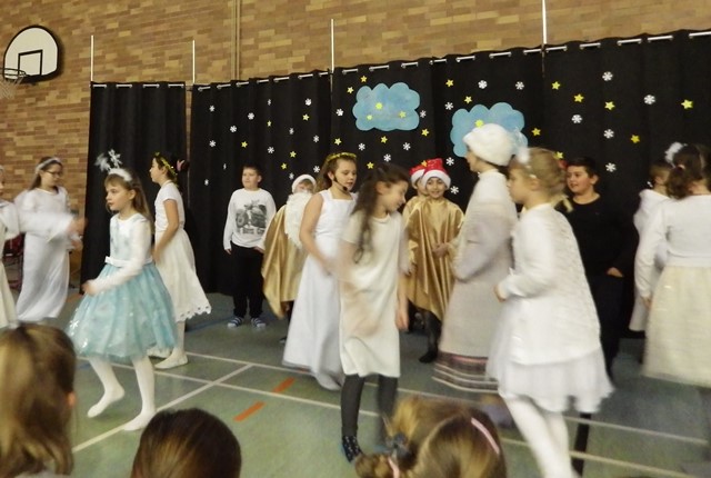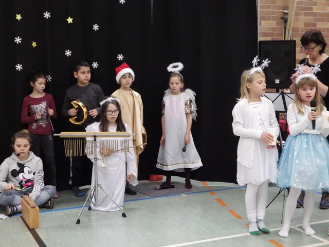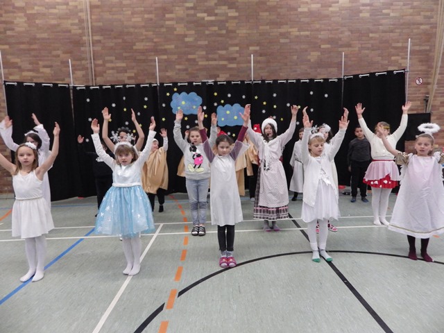 Mit dem Theaterstück „Himmlische Weihnachten“ begeisterten die Kinder der Theater-AG. Sie hatten mehrere Monate eifrig geübt und zeigten nun als Schneeflocken und Sternschnuppen, wie es im Himmel vor Weihnachten zugeht. Die Schneeflocken wollten auch einmal im Himmel gemütlich Weihnachten feiern und nicht auf die Erde hinabwirbeln. Doch Frau Holle wollte das nicht zulassen. Die Sternschnuppen hatten Mitleid und kamen ihnen zur Hilfe. Sie wollten stattdessen am Heiligen Abend zur Erde segeln und Wünsche erfüllen. Petrus und die drei Engel Luzia, Angela und Gabriela waren skeptisch, doch am Ende ging natürlich alles doch noch gut aus. Begleitet wurde das Stück von einem fröhlichen Tanz auf der Himmelswiese, den die Dritt- und Viertklässler mit viel Geschick vorführten.