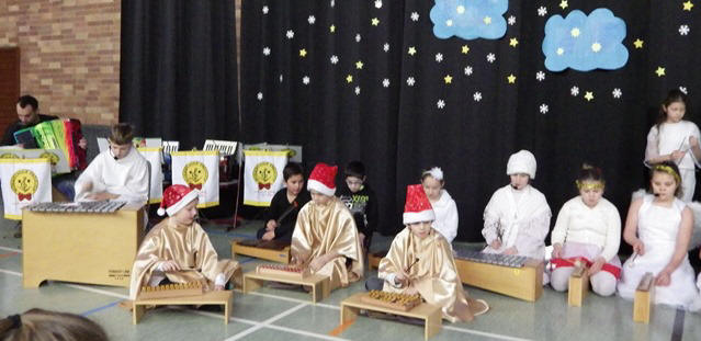 Zuerst sangen die Dritt- und Viertklässler das Lied „Eine Kerze leuchtet weit“ und begleiteten es mit Stabspielen und Rhythmusinstrumenten. Dann zeigten die Akkordeonspieler gemeinsam mit ihrem Musiklehrer Markus Häßler ihr Können. Dafür gab es von den Zuschauern großen Applaus.