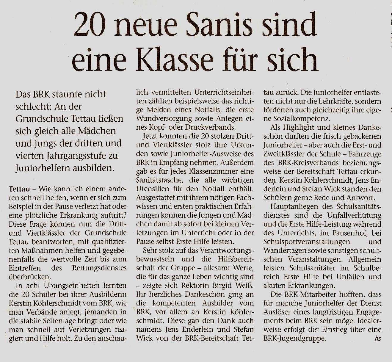 "In der letzten Septemberwoche kam Frau Köhlerschmidt vom Roten Kreuz zu uns. Sie bildete uns zu Schulsanitätern aus. Wir haben ein Päckchen mit Handschuhen, Verbänden, Pflastern und Dreieckstuch bekommen. Zuerst übten wir, wie man ein Pflaster richtig über die Fingerkuppe klebt. Man darf die weiße Fläche nicht berühren. Wir mussten Handschuhe anziehen, damit keine Bakterien in die Wunde kamen. Der Kopfverband, den wir danach angelegt haben, sah sehr lustig aus. Am nächsten Tag haben wir gelernt, wie man Blut stoppt. Man muss etwas, das kein Blut einsaugt, auf die Wunde pressen und dann einen Verband herumwickeln. Auch die stabile Seitenlage haben wir geübt. Zuletzt durften wir in den Krankenwagen steigen und die Rucksäcke mit dem Notfallmaterial genau ansch