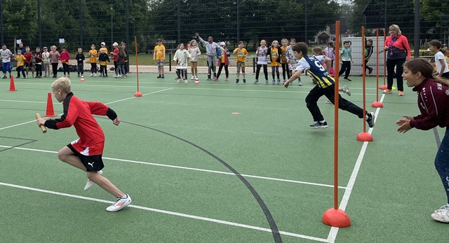 Nach den einzelnen Disziplinen folgte der nervenaufreibende Staffellauf für die Jahrgänge 1/2 und 3/4. Die Kinder mussten im Slalom um Hütchen laufen, wobei höchste Konzentration gefragt war: Kein Hütchen durfte ausgelassen werden, sonst gab es eine Zeitstrafe. Auch bei der Übergabe des Staffelstabs war Schnelligkeit und Genauigkeit gefragt – fiel der Stab zu Boden, rückte der Sieg in weite Ferne. Mit viel Teamgeist und Geschick kämpften die Kinder um den Sieg.