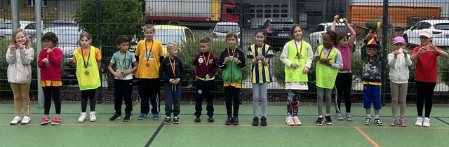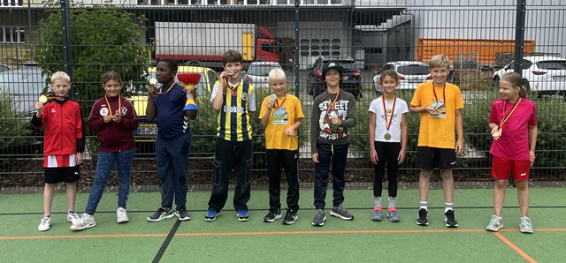 Am Ende des Tages gab es für die besten Teams Medaillen und einen Wanderpokal für den Gesamtsieger. Herzlichen Glückwunsch an Paul-Luca, Maria und Fola aus der Klasse 3/4 sowie an Emily, Pauline, Lawin, Dara und Sophie aus der Klasse 1/2!