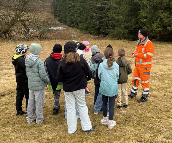 Zuerst führte uns der Wasserwart der Gemeinde Tettau, Kim Apel, zu einer Quelle, die das Grundwasser liefert. Hier erklärte der Fachmann, wie das Quellwasser ursprünglich aus der Erde stammt und durch verschiedene Filteranlagen gereinigt wird, um die hohe Trinkwasserqualität zu gewährleisten. Durch anschauliche Erklärungen und Beispiele erfuhren die Kinder, wie wichtig es ist, das Wasser zu schützen und warum sauberes Wasser so essenziell für unsere Gesundheit ist.